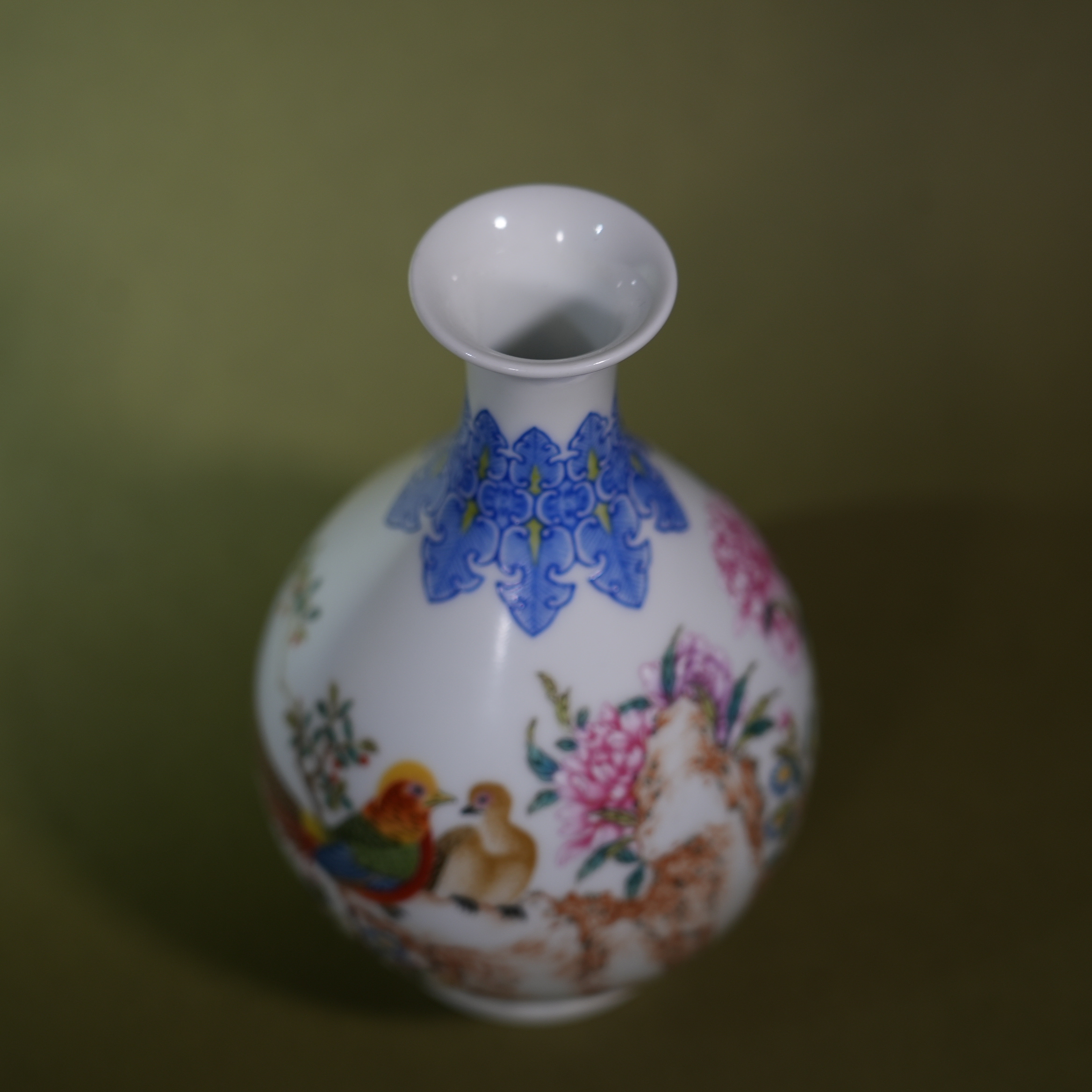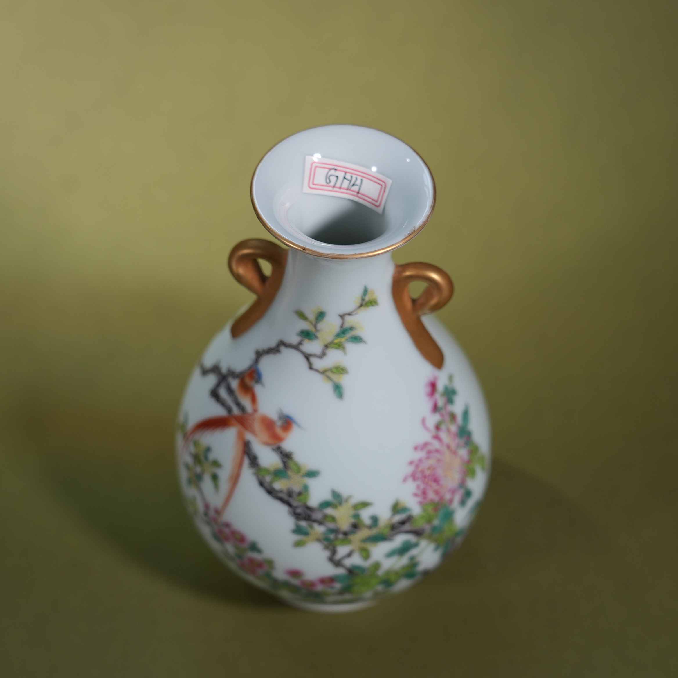 Ancient Chinese Famille Rose Bird and Flower Vase with Gilded Handles