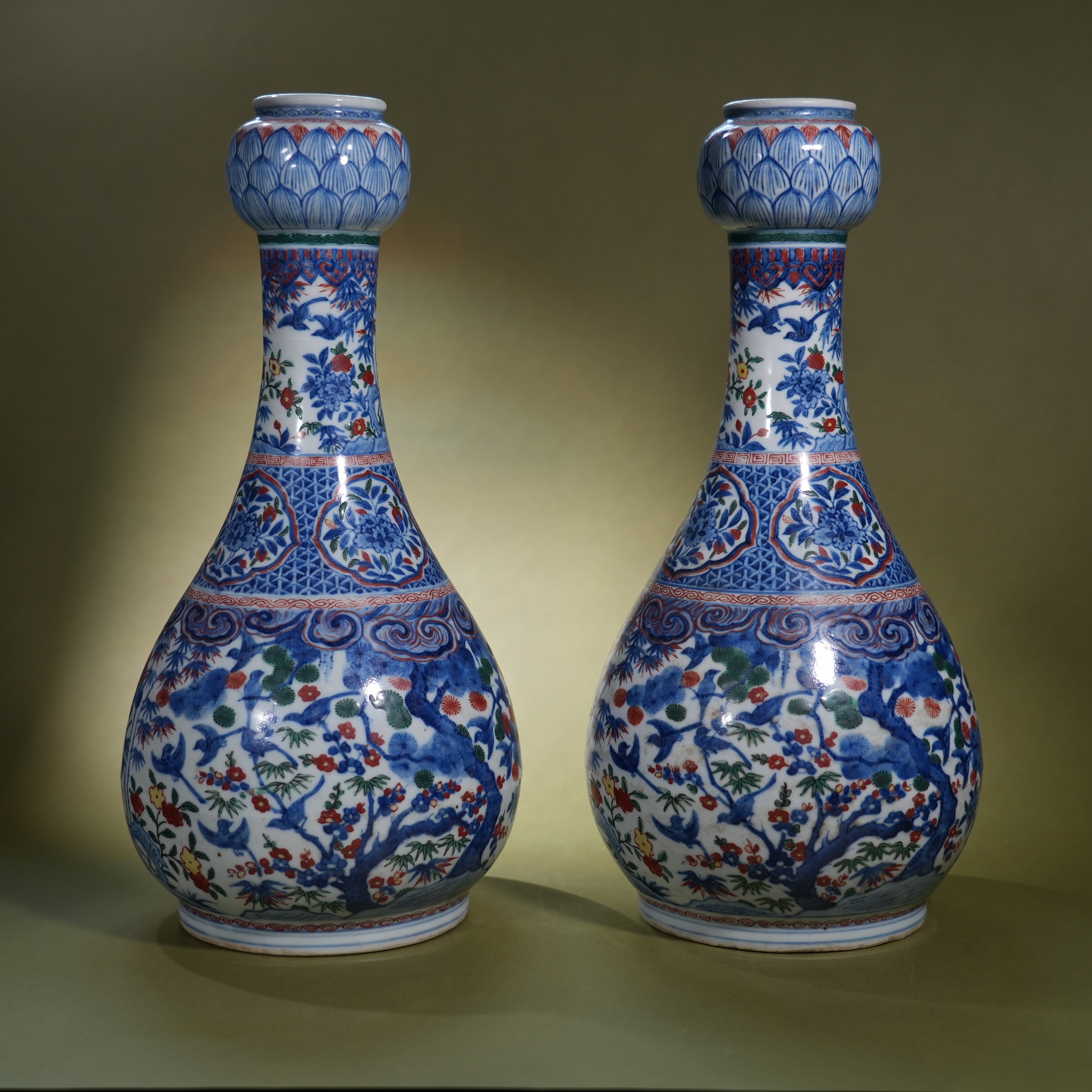 Ancient Chinese Wucai Garlic-head Porcelain Vases (Pair)